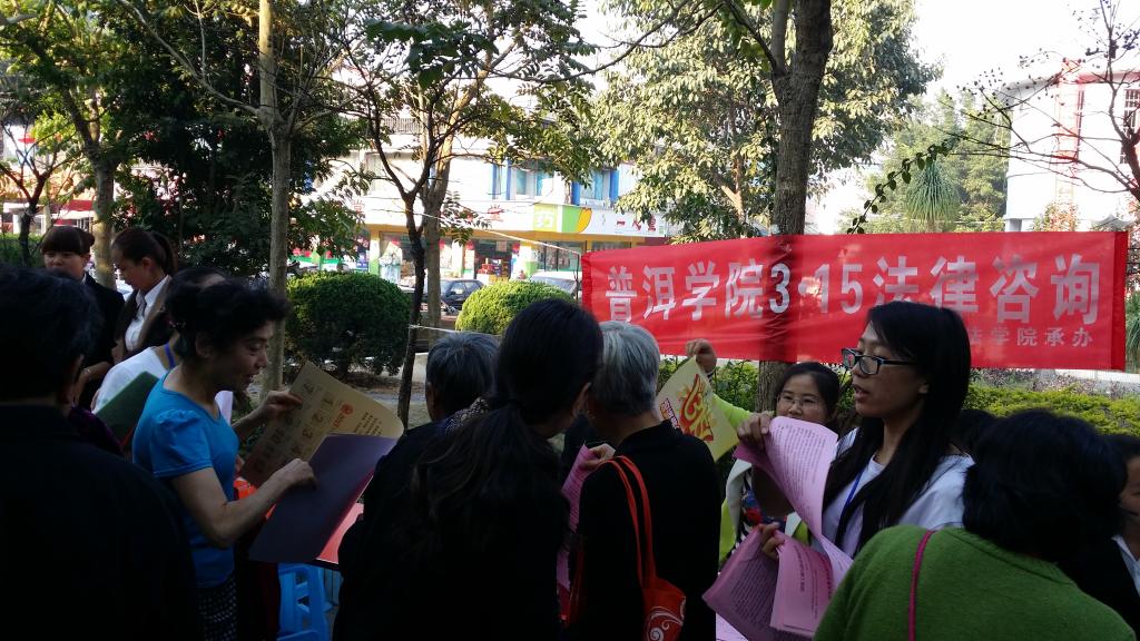 为贯彻落实党的十八届四中全会精神,普及消费者权益法律知识,我校政法学院和法律协会于3月15日协同普洱市工商局、普洱市消协组织开展了“3.15国际消费者权益日”宣传咨询服务活动。活动分别在beat365官方网站西区食堂广场和红旗会堂、天生祥旗舰店、大兴量贩等人流量较为集中的地方设置了法律咨询台并进行法律知识宣传单发放。