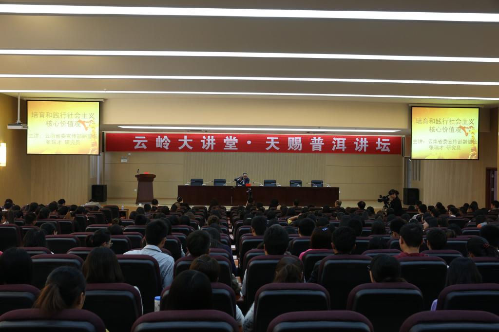 3月26日上午,云岭大讲堂在我校图书馆学术报告厅开讲,云南省委宣传部副部长、研究员、享受省政府特殊津贴专家张瑞才应邀作了题为《培育和践行社会主义核心价值观》的讲座。300余名师生到现场聆听了讲座。