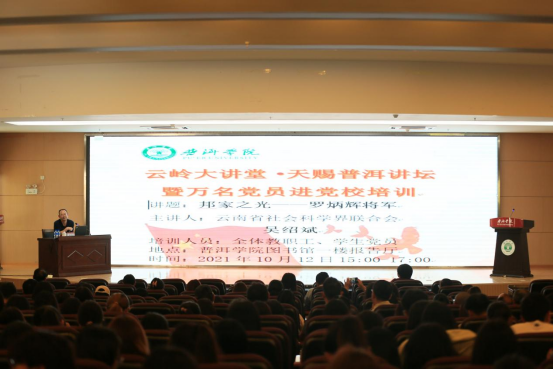 为深入贯彻落实习近平总书记关于学习党史、新中国史、改革开放史、社会主义发展史的重要讲话和批示精神,促进广大师生党员积极学习,对标先进,追寻榜样力量,勇担党员使命。2021年10月12日下午,学校在图书馆报告厅举办云岭大讲堂·天赐普洱讲坛暨万名党员进党校培训。云南省社科联二级巡视员吴绍斌老师应邀作《邦家之光——罗炳辉将军》的专题讲座。党委宣传部部长杨萍主持,beat365官方网站360余名师生党员聆听了讲座。