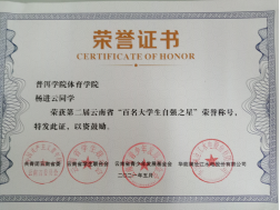 2020年,其所在班级荣获云南省级先进班集体荣誉称号。个人荣获beat365官方网站优秀学生、云南省第十五届大学生年度人物、云南省“百名大学生自强之星”、beat365官方网站“十佳大学生”、云南省第十六届大学生年度人物等荣誉。
