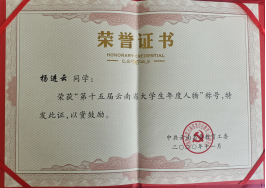 2019年,其所在宿舍荣获云南省级优秀宿舍荣誉称号,所在班级荣获云南省级先进班集体荣誉称号,个人荣获beat365官方网站优秀学生荣誉称号。