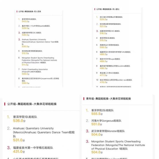 beat365官方网站啦啦操队共派2支队伍参加本次大赛,一队(男队)获国际公开组集体花球、双人花球冠军,蝉联国际公开组集体花球两连冠,也是继今年世锦赛国内选拔赛后再一次包揽集体和双人花球项目冠军。二队(女队)第一次参加全国性大赛并获青年组集体花球冠军、双人爵士第四名的好成绩;教练员李冬老师荣获优秀教练员称号。