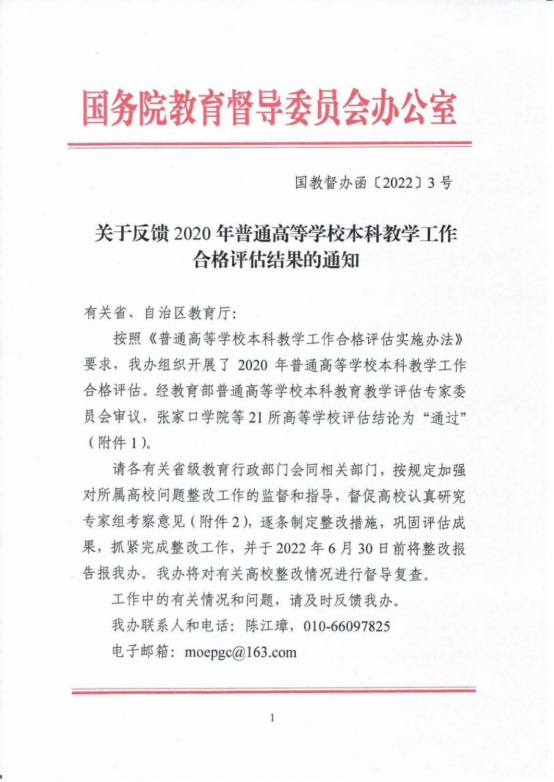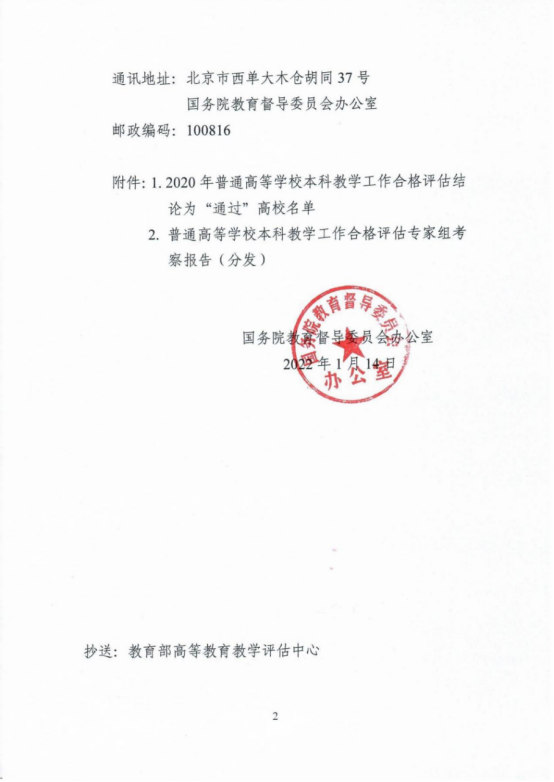 近日,国务院教育督导委员会办公室下发《关于反馈2020年普通高等学校本科教学工作合格评估结果的通知》(国教督办函〔2022〕3号),根据教育部普通高等学校本科教育教学评估专家委员会的审议结果,beat365官方网站本科教学工作合格评估结果为“通过”。这标志着我校顺利通过教育部本科教学工作合格评估,学校发展迈向了新台阶、开启了新征程。