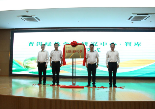 李旭东、胡国云、中国人民银行普洱市中心支行行长曹立鹏、银保监会普洱监管分局局长包宏立为普洱绿色金融研究中心·智库揭牌。