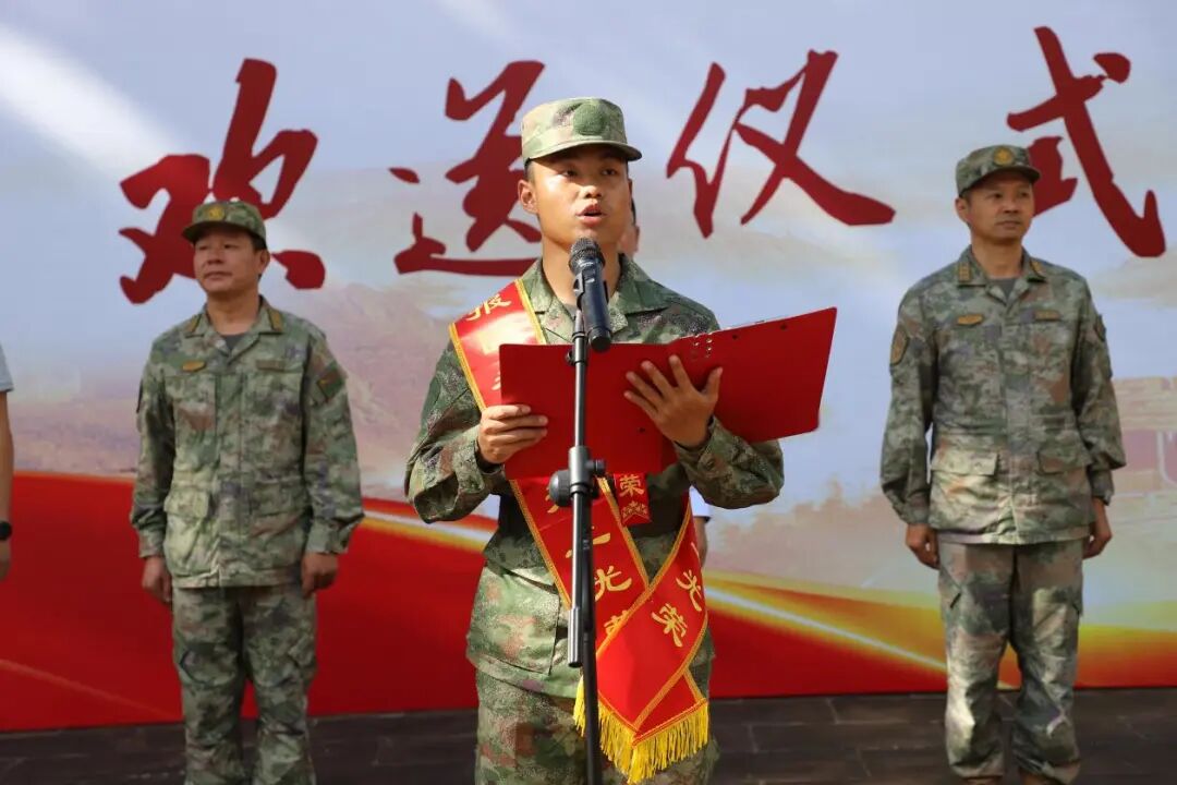 入伍学生代表发言表示,将携学校期望与家人嘱托,在部队中严格要求自己,刻苦训练,努力成为一名优秀的军人,为军旗添彩,为母校争光。