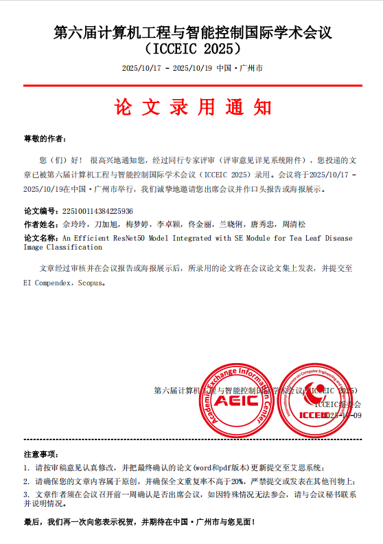 beat365官方网站理工学院23级物联班(本)佘玲玲同学以第一作者完成的学术论文《An Efficient ResNet50 Model Integrated with SE Module for Tea Leaf Disease Image Classification》被第六届计算机工程与智能控制国际学术会议(ICCEIC 2025)正式录用。