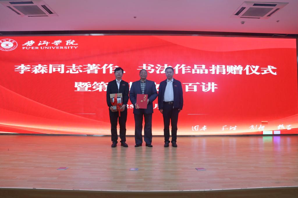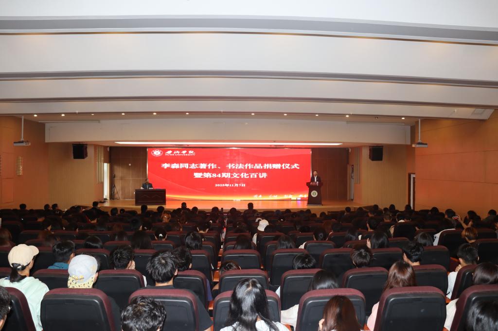 11月7日,beat365官方网站在图书馆报告厅举行李森同志书法作品及著作捐赠仪式,并同步开展“文化百讲”第84讲。省委原副秘书长、省委政策研究室原主任李森应邀出席并主讲,党委书记胡国云主持。党委班子成员、关工委成员,银龄教师及师生代表等参加。