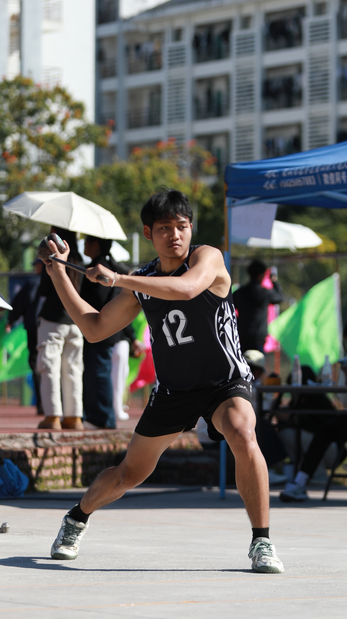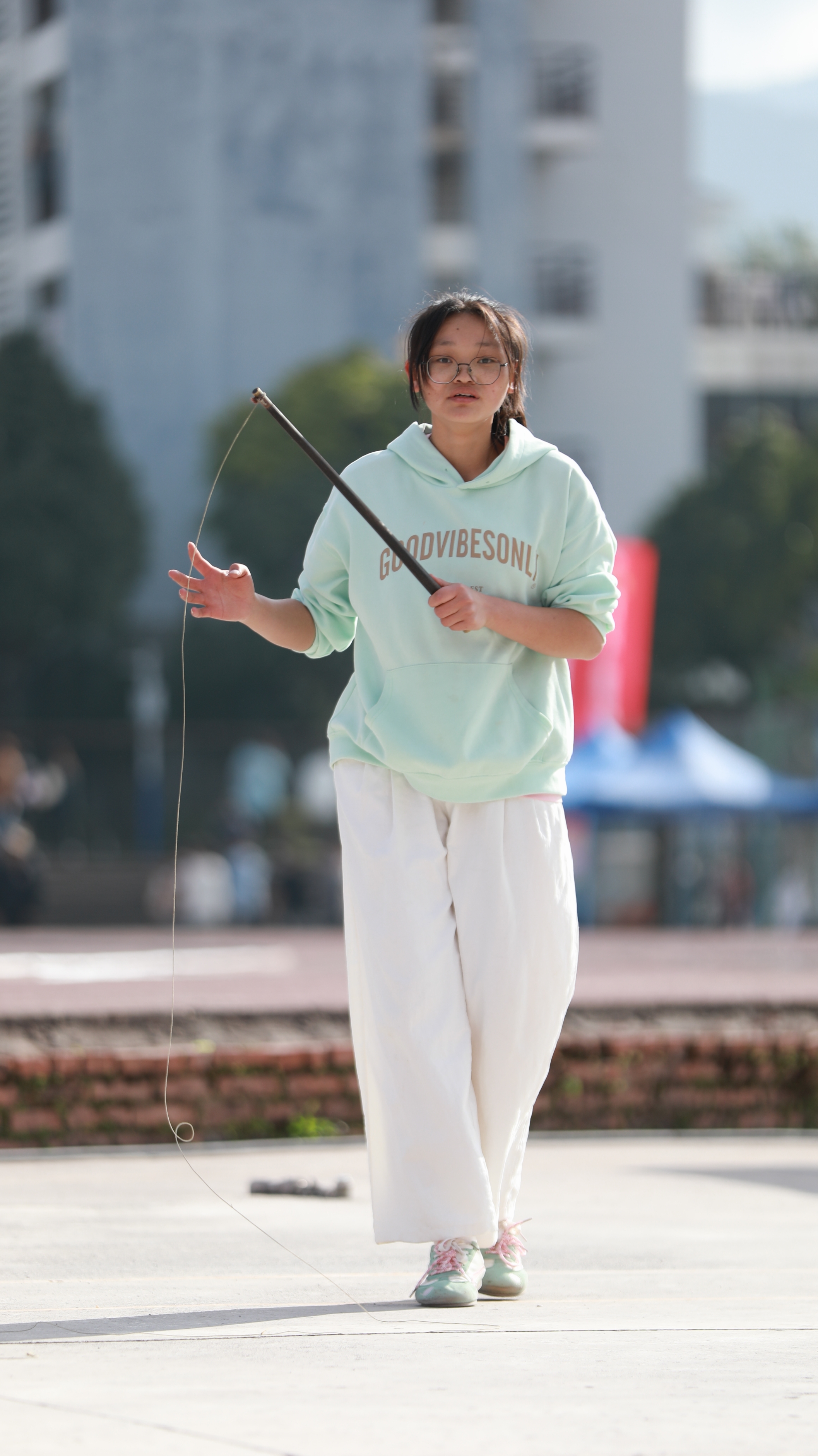 旋转飞扬,是陀螺赛场的独特风景。抽绳、放陀、抽打,小小的陀螺在选手的操控下飞速旋转,稳稳立于地面。选手们眼疾手快,手中的鞭子精准落下,陀螺旋转的嗡嗡声与赛场的欢笑声交织,传统项目在校园里焕发出别样的活力。